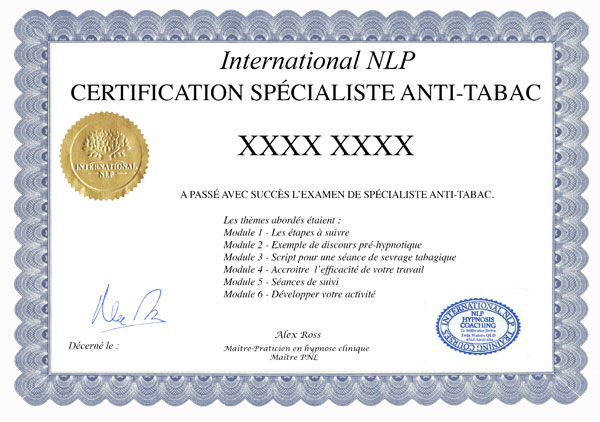 La formation « Spécialiste anti-tabac » est composée de six modules orientés vers l'action. C'est un système d'apprentissage accéléré qui vous donnera des techniques de pointe en termes d'influence mentale et de persuasion.