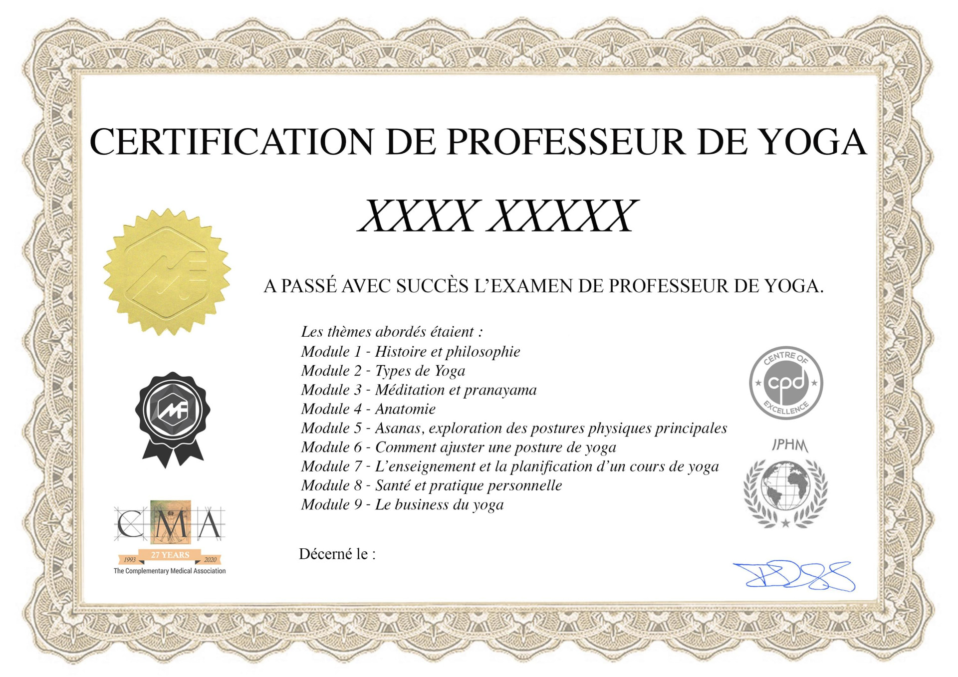 Le programme proposé ici est reconnu parl'IPHM (International Practioners of Holistic Medecine), le CMA (Complementary Medical Association) et le CPD (Centre of Excellence), ce qui permet à celles et ceux qui le souhaitent, de s'installer et d'enseigner le Yoga. Vous trouverez d'ailleurs dans la formation un module consacré à l'installation en tant que professionnel et des conseils précieux pour démarrer.